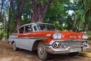 Red american Chevrolet parked under palms in Santa Clara Cuba